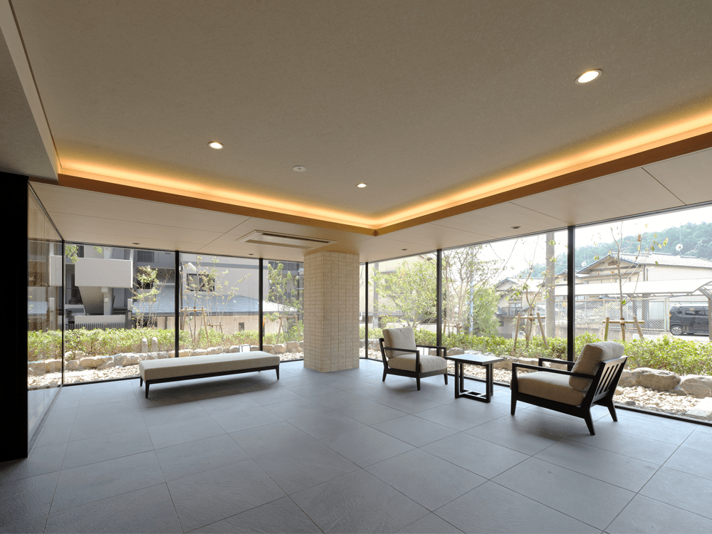 敷地内にも植栽帯を多く設ける事により、四季折々の表情を見せ、前面道路に面する部分の大半を石垣積みとする事により、周辺環境に溶け込んだ外観になっており、美しい和の雰囲気を醸し出しています。