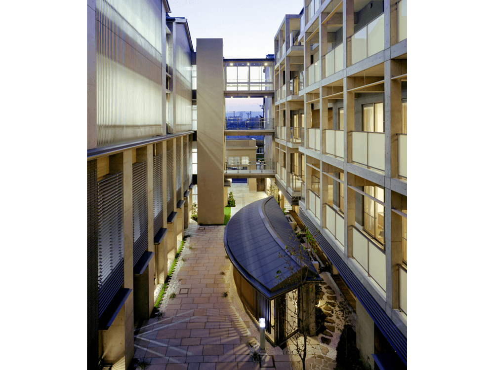 元本能寺周辺という古い史跡の区域で、由緒ある京都市立本能小学校跡地に建設されました。京都市の特別養護老人ホームを中心に、京都市立堀川高校分室、地元自治会施設を備えた複合施設です。